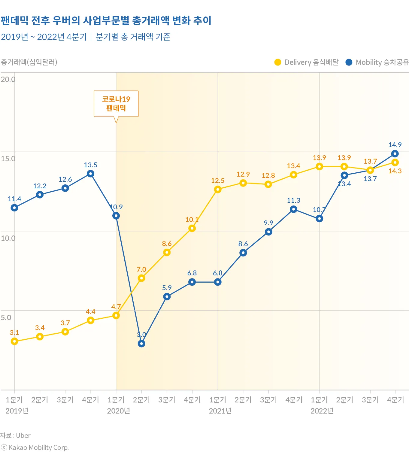 팬데믹으로 여객 수요의 타격을 받은 글로벌 모빌리티 플랫폼도 라스트 마일 배송 영역으로 빠르게 확장했다. 우버는 2019년 4분기 135억 달러에 달했던 승차공유 부문의 총거래액(GMV)이 팬데믹 직후인 2020년 2분기 30억 달러로 4분의 1 수준으로 급감하였는데, 같은 기간 우버의 음식배달 부문인 우버이츠의 이용은 급증하였다. 팬데믹 이후 2년간 우버는 모빌리티보다 음식배달 플랫폼에 더 가까울 정도로 음식배달 부문의 총거래액 규모가 컸다.