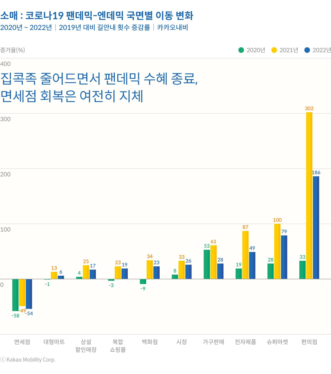 거리두기 전면 해제로 본격화된 엔데믹은 한동안 얼어붙었던 이동의 제약을 해제한다는 의미에서 이동량의 증가와 연결되기 쉽지만, 모든 도착지에 대한 이동이 늘어난 것은 아니었다. 코로나 특수를 누렸던 일부 업종들은 엔데믹 이후 상대적으로 사람들의 발길이 줄어드는 모습을 보였다. 팬데믹 기간 동안 사람들이 발길이 뜸해졌던 일부 업종은 거리두기 해제에도 불구하고 여전히 이전 수준을 회복하지 못하고 있기도 했다. 반면, 팬데믹 기간 늘어난 사람들의 발길이 엔데믹 이후 더욱 탄력을 받는 경우도 있었다.