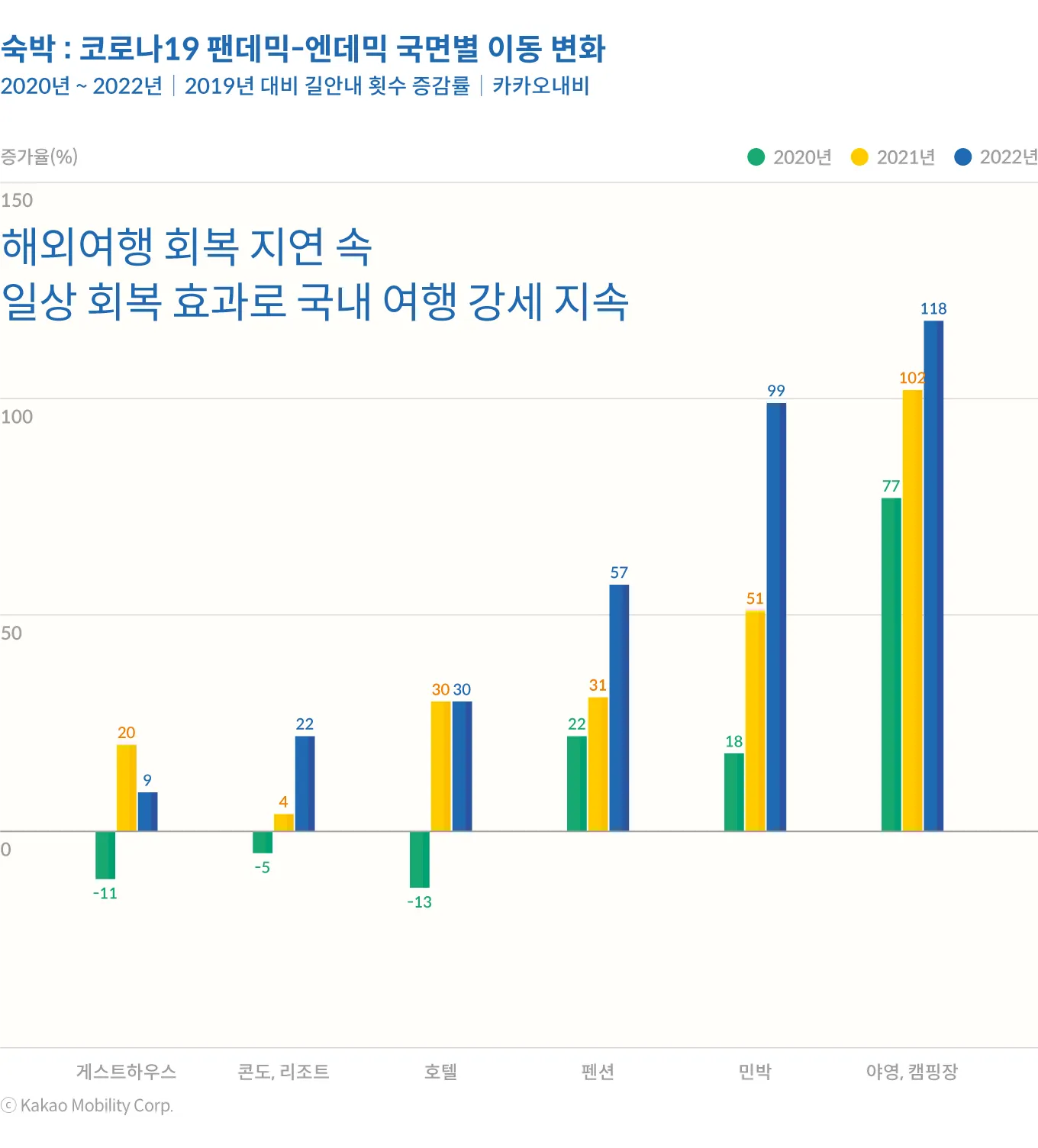 숙박은 국내 여행 수요의 영향이 지속되는 모습이었다. 거리두기 해제로 여행 수요는 더욱 자극을 받았을 것으로 보이나 여전히 해외여행은 조심스러운 상황이 계속되면서 국내 여행으로의 쏠림은 지속되는 것으로 나타났다. 팬데믹 기간 감염 우려가 적으면서도 힐링이 가능한 장점으로 수요가 급증했던 야영/캠핑장(118%)으로의 이동량은 엔데믹 이후에도 지속되면서 식지 않는 인기를 보여주었다. 민박(99%), 펜션(57%) 등 비교적 소수의 인원이 이용 가능한 숙박 시설뿐만 아니라 호텔(30%), 리조트(22%) 등 다중이용시설을 찾는 발길도 거리두기 해제 이후 계속되었다.