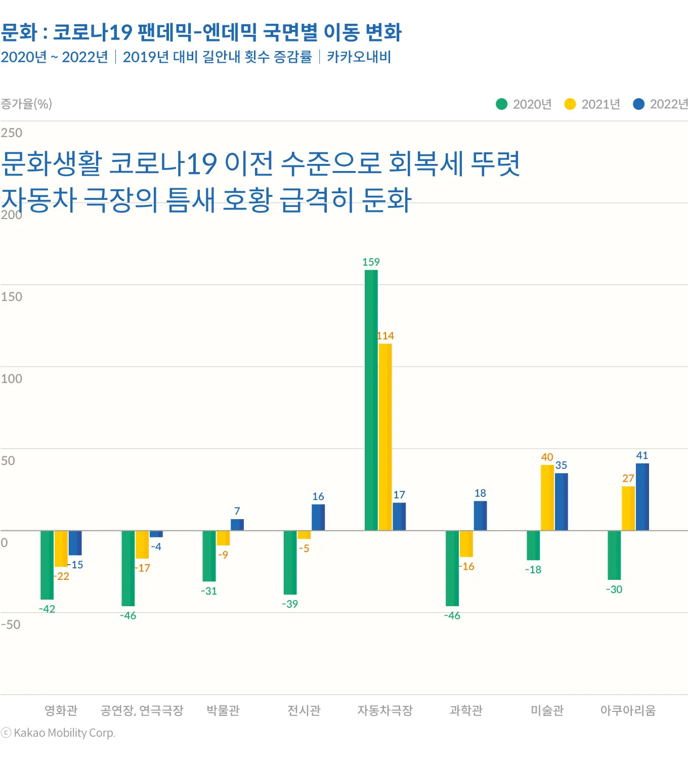 팬데믹 기간 동안 크게 위축되었던 문화생활은 회복세가 뚜렷했다. 코로나 1년 차, 2년 차 모두 마이너스 증가율을 보였던 박물관(7%), 전시관(16%), 과학관(18%)으로의 이동이 플러스 증가율로 전환되었으며, 미술관(35%)과 아쿠아리움(41%) 모두 작년을 필두로 지속적인 상승세를 보이고 있다. 영화관(-15%)과 공연장, 연극극장(-4%)은 여전히 코로나19 이전 수준에 미치지 못하고 있지만 회복세는 지속하고 있다. 한편, 팬데믹 기간동안 틈새 호황을 누리던 자동차 극장은 팬데믹 기간 동안 코로나19 이전 대비 세자리 수의 증가율을 나타냈지만 2022년에는 17%로 급격하게 낮아지면서 코로나19 이전으로 빠르게 회귀하는 모습이다.