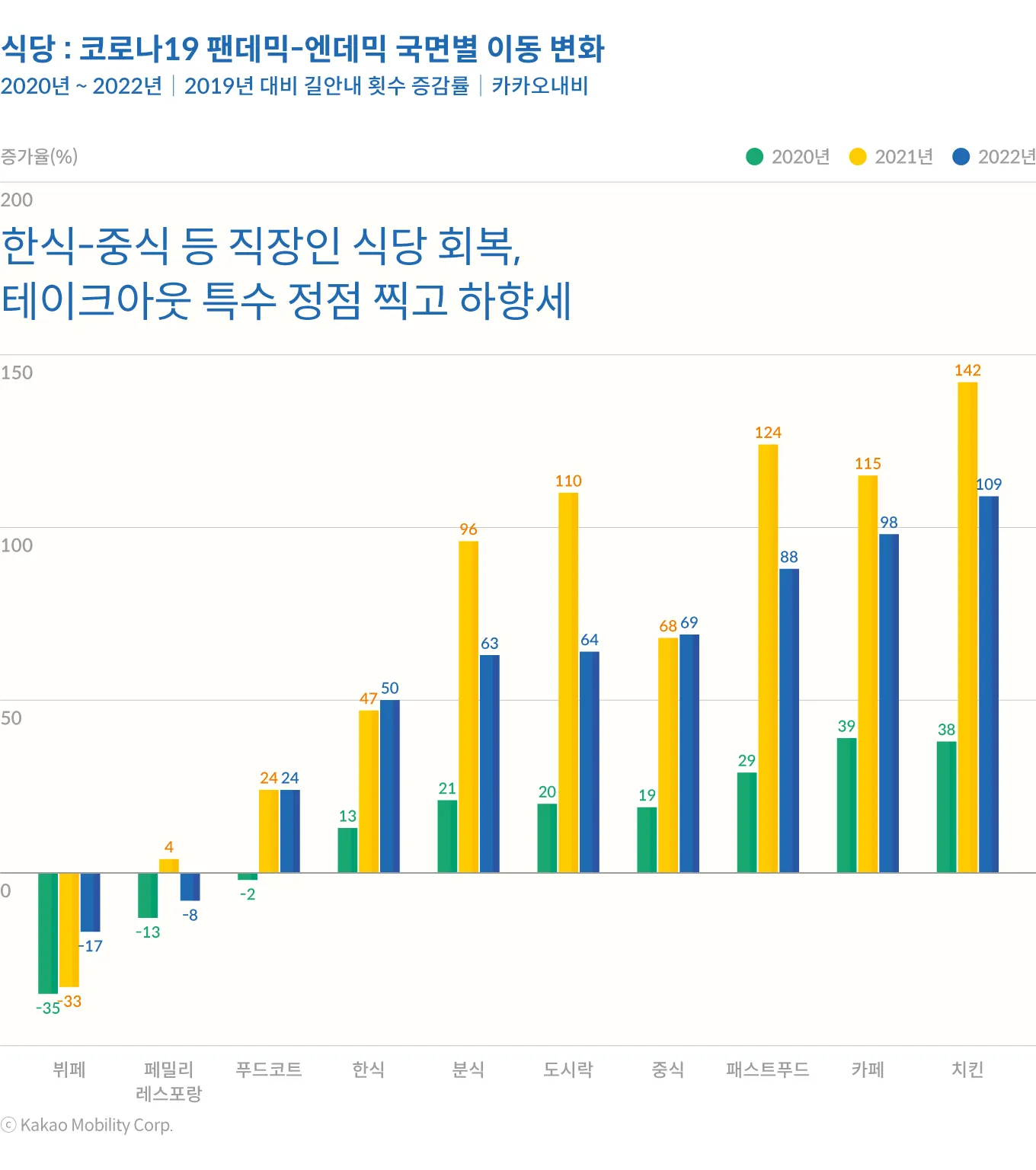 식당 방문의 전반적인 패턴은 소매점 방문 패턴과 유사한 모습이다. 분식(63%), 도시락(64%), 패스트푸드점(68%), 치킨(109%) 등 코로나19로 인해서 강세를 보였던 테이크 아웃 식당들이 정점을 찍고 하락하는 모습이다. 사무실 출근이 재개됨에 따라 직장인들이 자주 찾는 한식(50%), 중식당(69%), 푸드코트(24%) 등으로의 이동은 엔데믹 이후 소폭 증가한 것으로 나타났다. 단체 손님 중심인 뷔페(-17%), 패밀리레스토랑(-8%) 등은 여전히 코로나19 이전 수준을 회복하지 못한 것으로 나타났다.