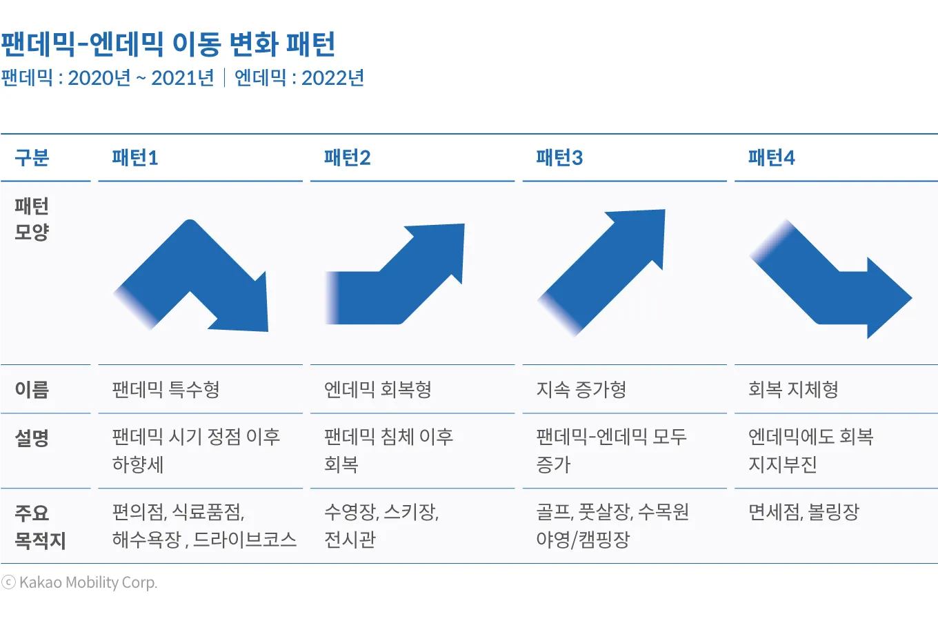 엔데믹 이후 이동 변화는 4가지 유형으로 요약 팬데믹 특수형, 엔데믹 회복형, 지속증가형, 회복 지체형