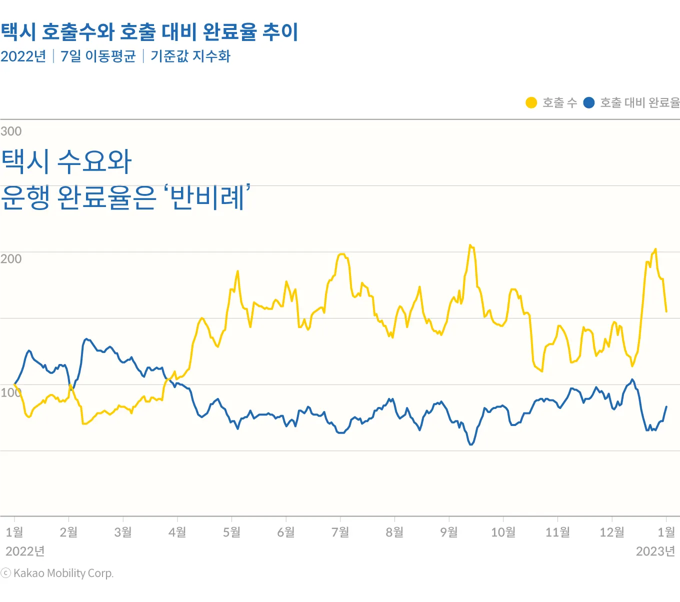 승객이 택시를 호출해서 목적지까지 얼마나 잘 갈 수 있는지를 나타내는 운행 완료율과 택시 수요를 나타내는 호출수의 추이를 보면 반비례하는 경향이 뚜렷하다. 2022년 4월 사회적 거리두기가 해제되면서 택시 호출수는 급증하게 시작하였는데, 이에 비례하여 택시의 운행 완료율은 낮아지기 시작하였다. 2022년 11월 이후에는 개인택시 부제해제, 심야 탄력호출료 도입 등 정부 정책의 효과로 운행 완료율의 개선 추이도 나타났지만, 택시 수요와 운행 완료율의 관계가 완전히 변화하지는 못했다. 택시 수요가 추세적으로 증가하여도 택시 시장의 가격인 요금이나 택시 기사의 공급 수준은 크게 변동하지 못한 영향이 크다.