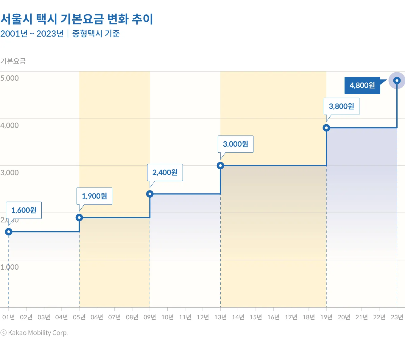 서울의 경우 최근 20여 년간 4~6년마다 운임·요율을 조정해 왔다. 인건비, 연료비는 매년 변동하고, 시장의 수요도 시시각각 변화하고 있지만, 기본적인 가격 수준은 평균 4년 이상의 기간을 두고 계단식으로 조정되고 있는 것이다. 장기간 고정되었던 요금이 한꺼번에 인상되면서 택시 수요가 급감하는 부작용의 가능성도 열려있다. 서울시 택시 이용 건수는 택시 요금이 인상되었던 2019년에 3억 7,562만 건으로 2018년 4억 2,328만 건에서 11.3%가 감소하였다.