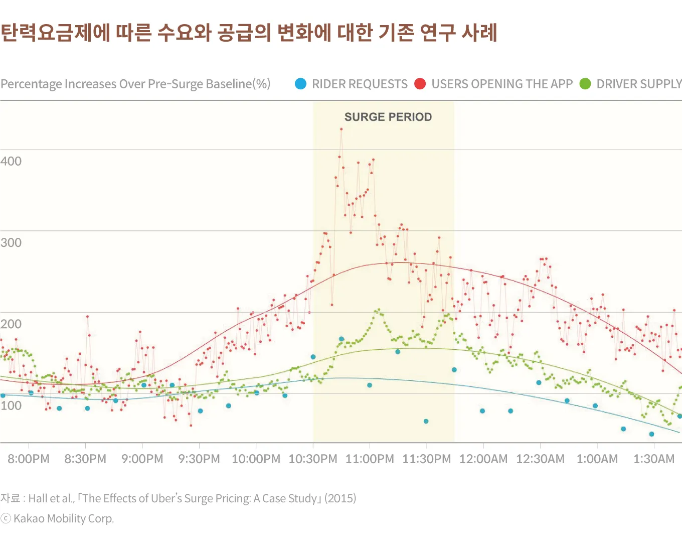 AI 알고리즘, 앱미터기, 앱 결제 등은 시장의 상황에 맞는 요금을 설정할 수 있는 기반을 제공하였다. 선진국 택시 시장에 이미 자리 잡은 플랫폼 기반의 탄력요금제가 대표적이다. 시시각각 변하는 수요에 맞게 요금도 시시각각 변화하고, 공급도 가격 기제에 맞게 탄력적으로 반응하고 있다. 이에 대한 다양한 연구결과도 뒷받침되고 있다. Hall et al.(2015)은 「The Effects of Uber’s Surge Pricing: A Case Study」에서 사례 분석을 통해서 우버의 탄력요금제인 ‘Surge Pricing’이 수요와 공급을 효과적으로 균형화하였으며, 수요의 급증에도 배차 시간이 많이 증가하지 않았음을 보여주었다. Castillo(2020)은 「Who Benefits from Surge Pricing?」에서 탄력요금제 적용 상황과 미적용 상황의 승객, 기사 등의 후생 변화를 비교 분석하였는데, 탄력요금제 적용 시 승객과 기사의 지리적 불일치가 감소하고, 대기시간이 감소하면서, 승객(6.97%), 기사(1.97%), 플랫폼(1.42%) 등 전체 참가자의 후생 증가가 나타남을 보여주었다.