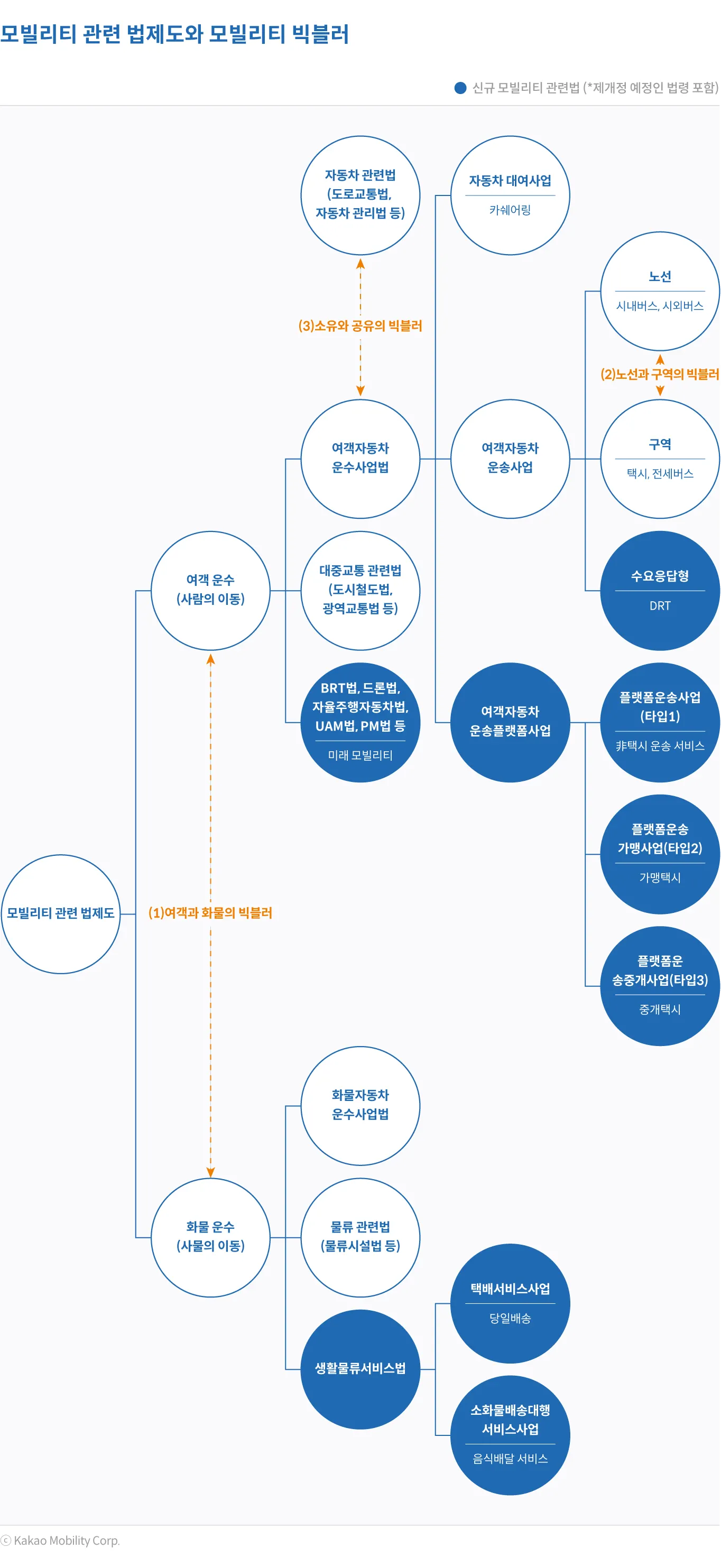격변이 예고되고 있는 모빌리티 시대에 대응하기 위한 제도적 준비도 필요하다. 모빌리티 산업의 급성장하면서 정부에서도 운송 플랫폼 사업 제도화(2020년 3월 국회 통과), 자율차법(2020년 5월) 제정, 생활물류법(2021년 7월) 제정 등 법적 기반 마련을 했고, UAM법, 드론법 등 미래 모빌리티를 위한 법안도 준비 중에 있다. 다만, 다양한 이동 분야 간 융합으로 등장하는 신산업을 어떻게 제도적으로 담아낼 지에 대해서는 과제가 될 것이다. 각 법령별로 영업이 가능한 시장 참여자 및 소관부처가 구분되고, 이에 따라 이해관계자들의 범위도 결정되고 있는 상황에서 모빌리티에 다가올 빅블러 현상을 어떻게 수용할지를 고민해야 할 것이다.