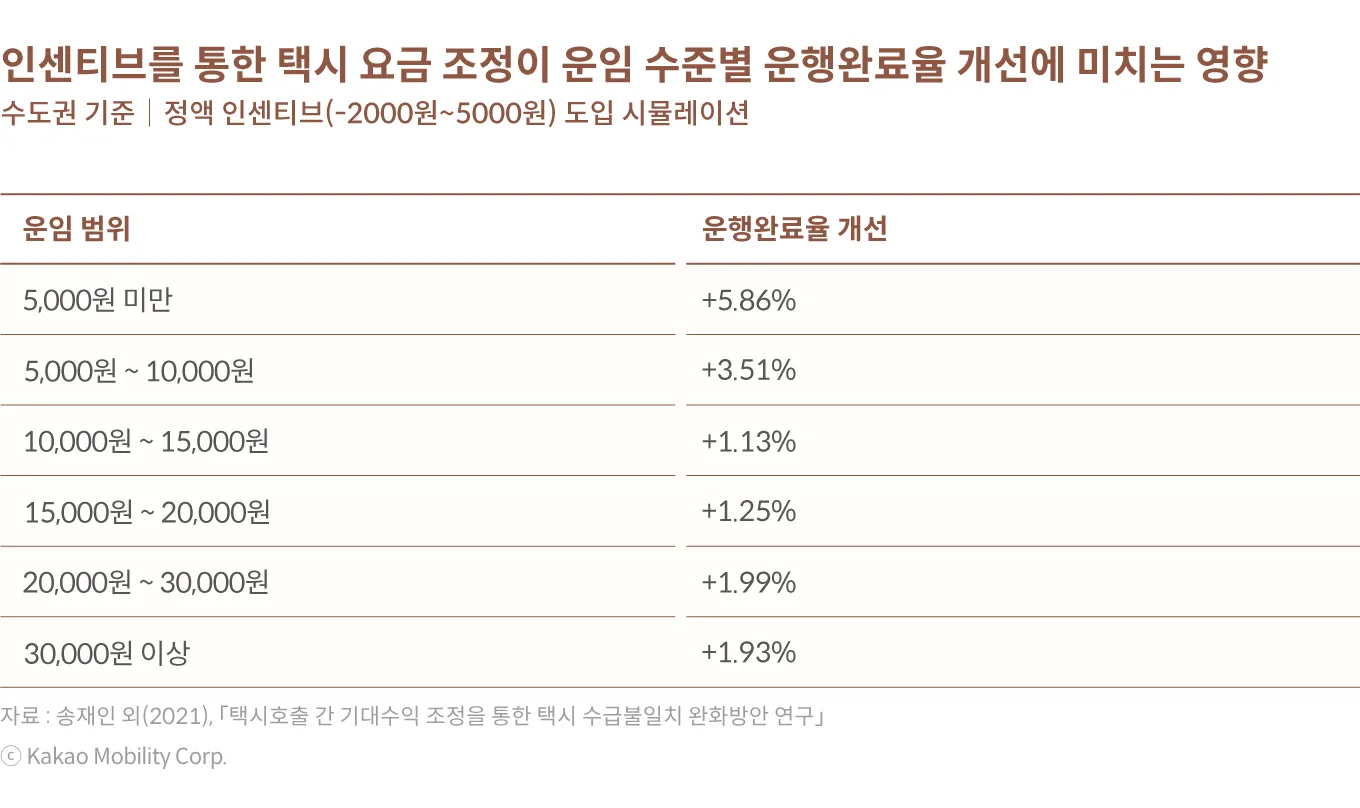 탄력적인 요금 조정은 국내 택시 시장의 수요와 공급 불균형을 완화하는데 도움이 될 것으로 보인다. 송재인, 강민희, 황기연은 「택시호출 간 기대수익 조정을 통한 택시 수급불일치 완화방안 연구」에서 택시 운행 데이터를 통해 강화 학습 기반 호출 간 기대수익조정 시뮬레이션을 수행하였다. 택시 호출의 출발지와 도착지에 따른 운행완료율이 다른 상황에서 운행완료율이 낮은 호출에 대해서는 플러스(+) 인센티브를 부여하여 기사들에게 배차를 수락할 유인을 제공하고, 운행완료율이 높은 호출에 대해서는 평균적인 운행완료율 이상이 되는 수준에서 마이너스(-) 인센티브를 부여하였다. 인센티브로 인해서 기사들의 수입이 변동되는 만큼 사실상 요금 조정의 효과가 발생하는 것이다. 분석결과, 인센티브(-2000원~5000원) 도입에 따라 플러스 인센티브가 적용된 호출에서 18%의 수준의 운행완료율 증가, 마이너스 인센티브가 적용된 호출에서 –8.5% 수준의 운행완료율 감소가 나타나며, 전체 운행완료률이 약 4% 개선되는 것으로 나타났다. 각 호출별 요금 수준을 보면, 운임 5,000원 미만의 단거리에서 운행완료율 개선이 가장 높게 예측되었다. 운행완료율의 개선은 승객의 대기시간 감소로 편익 증대로 나타나고, 기사의 입장에서는 인센티브를 제공받음으로써 배회(대기) 시간이 보다 감소할 것으로 예상되어 편익이 증대할 것으로 기대되었다.