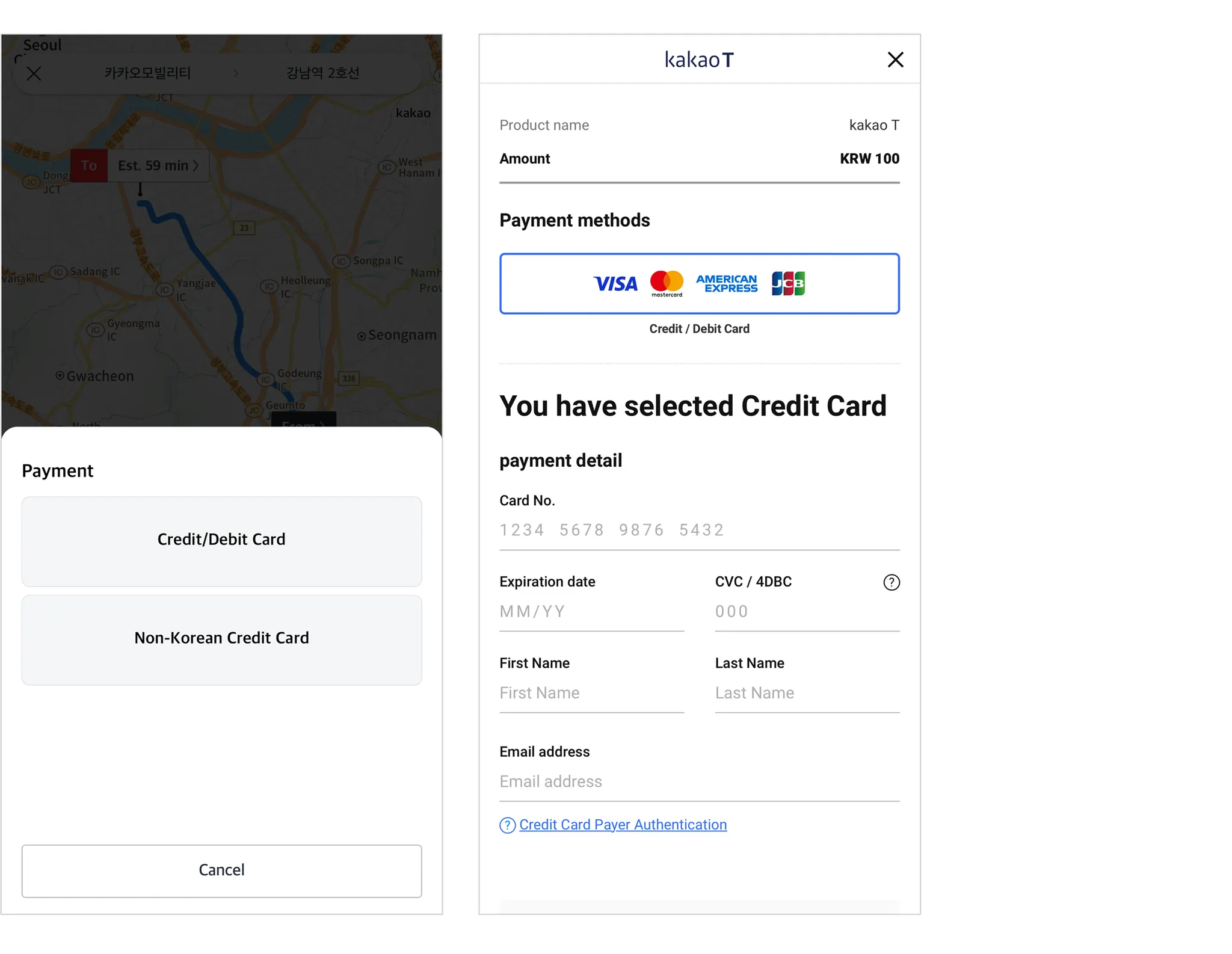 국내에 적용된 대부분의 간편 결제 수단들은 본인 확인을 필수로 하기 때문에 외국에서 발행한 신용카드는 배달 등 다른 플랫폼과 마찬가지로 카카오 T 앱에서도 등록하여 사용하는 데 제한이 있었다.