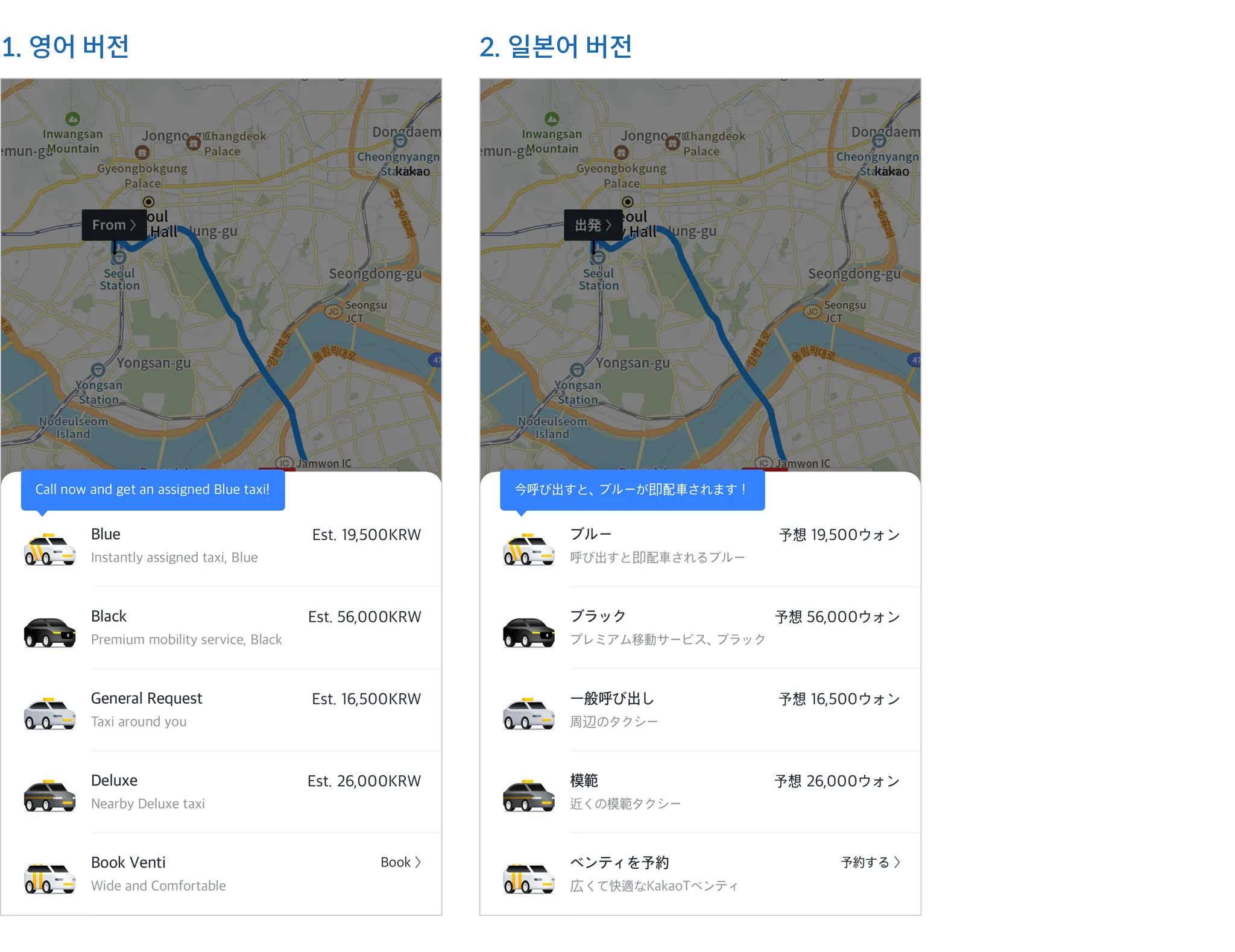 카카오 T 택시 호출 시 앱 화면 (다국어 버전)