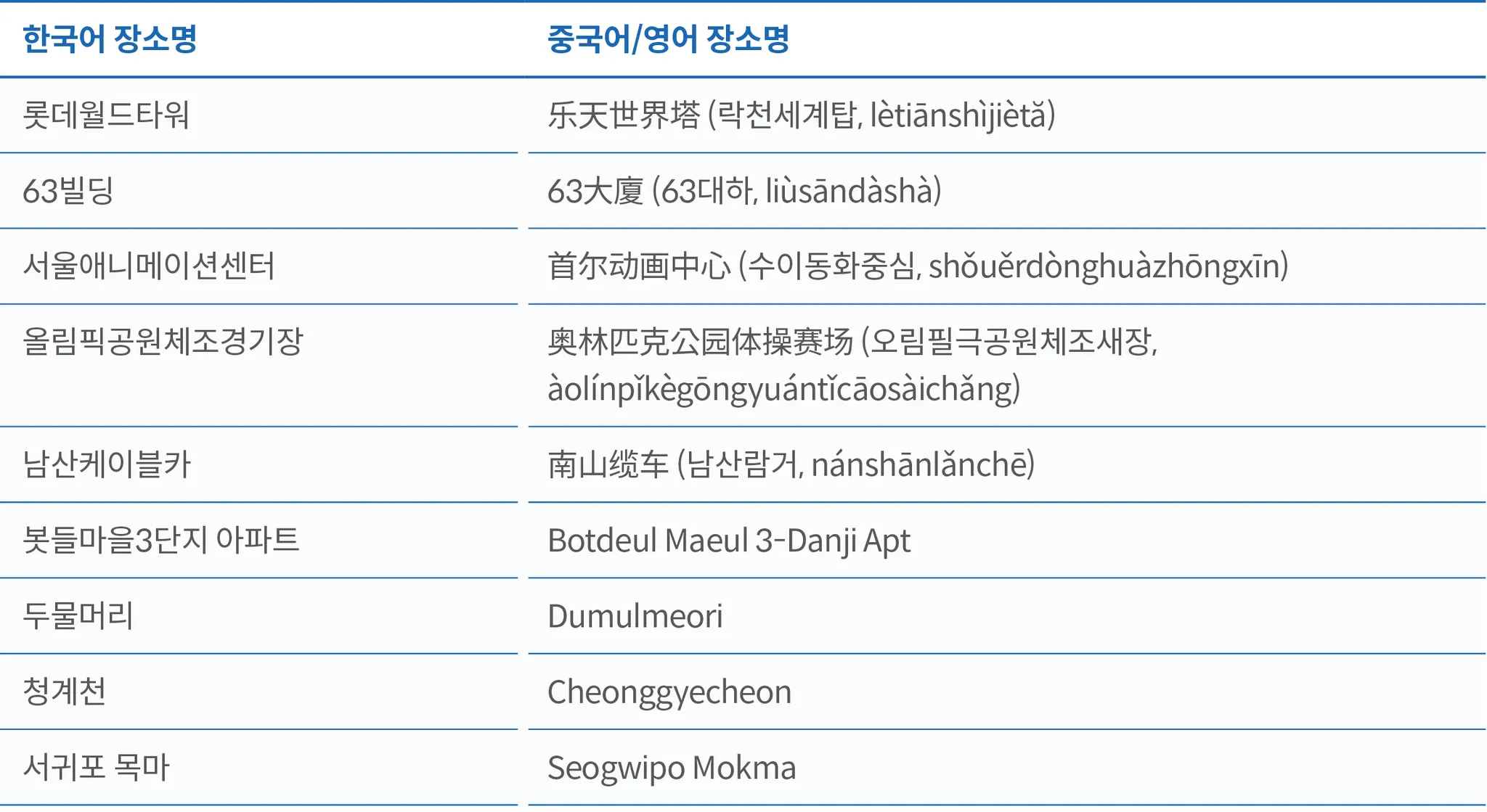 국내 주요 행선지의 언어별 장소명