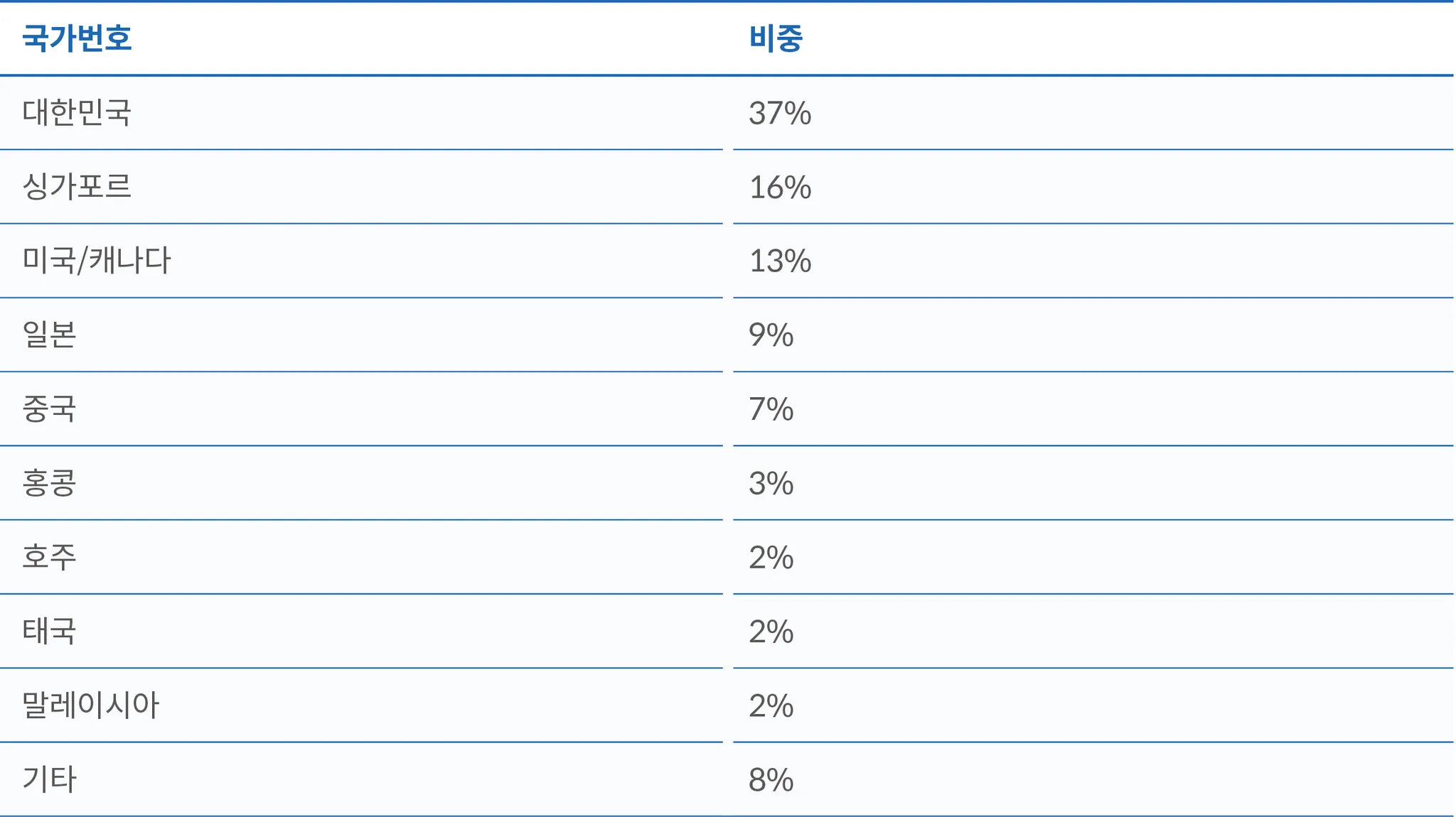 대한민국 외의 국가번호를 사용하는 외국인 이용자들 중에서는 미국/캐나다(13%), 일본(9%), 중국(7%) 이 높은 비중을 차지한다. 한국을 방문하는 외국인 관광객의 주요 구성 국가가 이들 국가임을 반영한다. 특이한 점으로 싱가포르의 국제전화번호 코드의 비중이 16%로 상당히 높게 나타났다는 것이다. 이는 싱가포르를 거쳐 국내에 유입되는 중화권 관광객의 영향으로 해석된다.